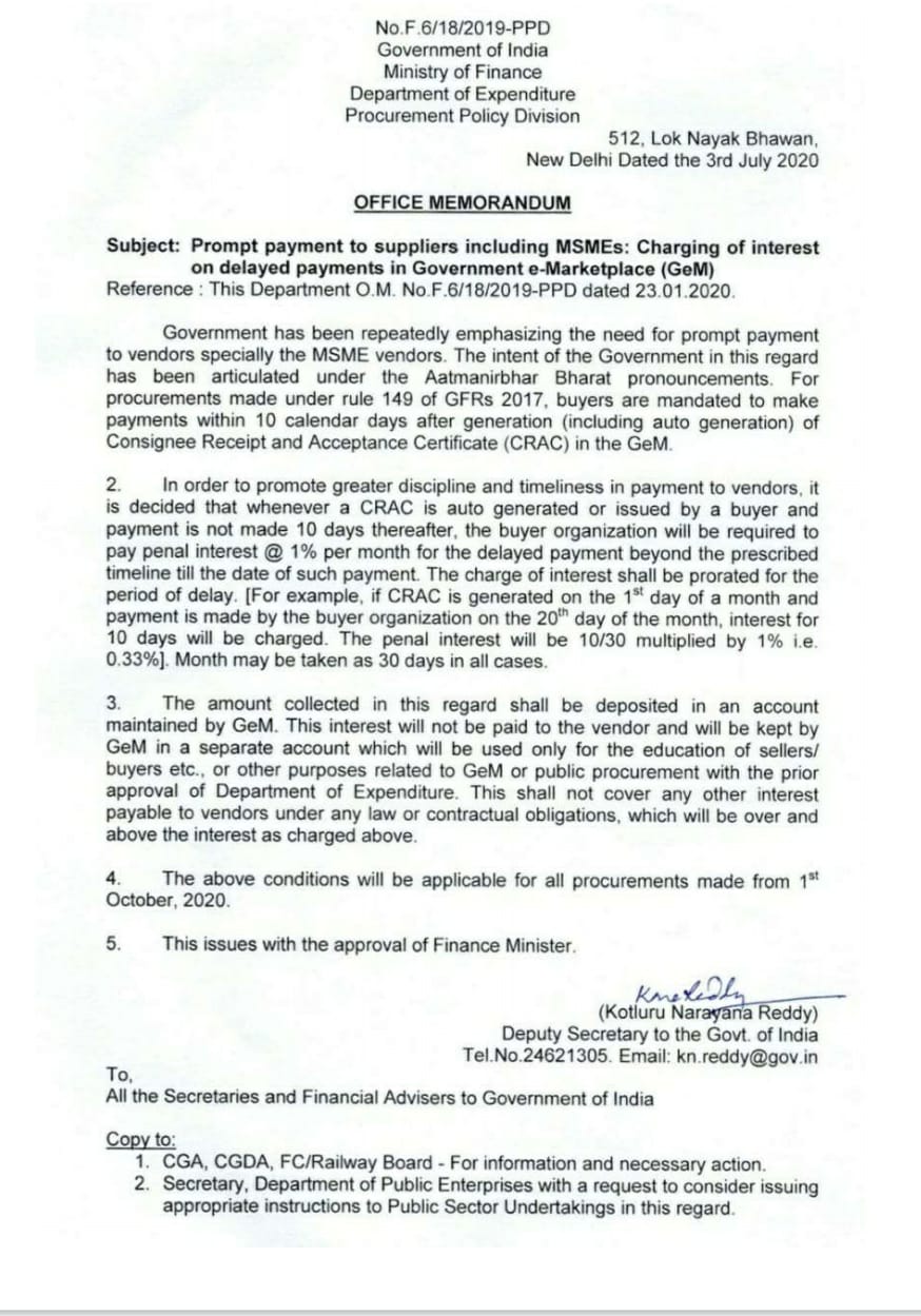 Prompt payment to suppliers including MSMEs: Charging of interest on delayed payments in Government e-Marketplace (GeM)